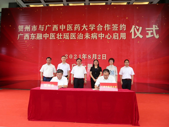 2021年8 月2日,贺州市与beat365正版唯一入口必一合作签约仪式、广西东融中医壮瑶医治未病中心启用仪式在贺州市中医医院举行。贺州市委书记林冠、beat365正版唯一入口必一校长姚春到场见证签约,并共同为广西东融中医壮瑶医治未病中心揭牌。贺州市委常委杨育智、beat365正版唯一入口必一副校长戴铭分别代表双方签署《贺州市人民政府 beat365正版唯一入口必一市校合作框架协议书》。