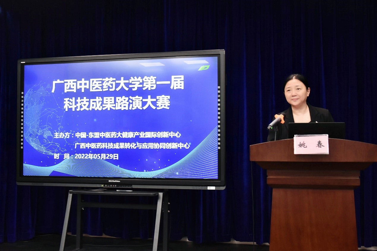 为深入贯彻落实党中央和自治区的部署,实施创新驱动发展战略,更好地搭建学校科技成果转化宣传平台,打通科技成果转化的“最后一公里”,5月29日,beat365正版唯一入口必一第一届科技成果路演大赛在学校仙葫校区图书馆8楼演播室隆重举行。beat365正版唯一入口必一校长姚春出席并致辞,党委办公室、校长办公室、人事处、教务处、科技处、学科建设办公室、招生与就业处、成果转化与社会服务处、基础医学院、药学院、壮医药学院、公共卫生与管理学院、海洋药物研究院以及学校第一附属医院、附属瑞康医院、附属国际壮医医院、制药厂等单位(部门)负责人参加。大赛由成果转化与社会服务处处长唐红珍主持。