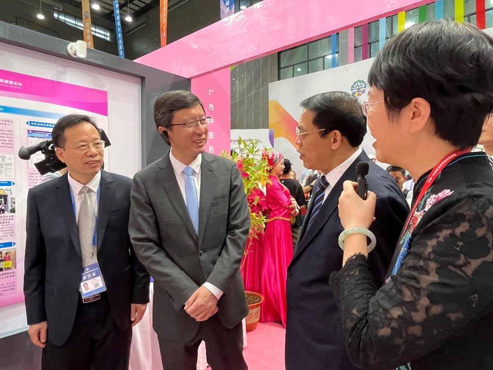 本次联展暨论坛以“共建产教集聚融合平台 共享职业教育发展成果”为主题,由“会、展、论、赛”多项活动组成。学校积极参与联展活动,以饱满的热情全面展示了学校在中医药高层次人才培养、国际合作与交流、国际教育等方面的成绩。巡展期间,莫锦荣向到访的教育部和自治区领导、国内外嘉宾展示学校在“桂十味”研究、中医药大健康产品研发等方面的成果,得到了参会领导、专家及各方代表的高度重视和认可。