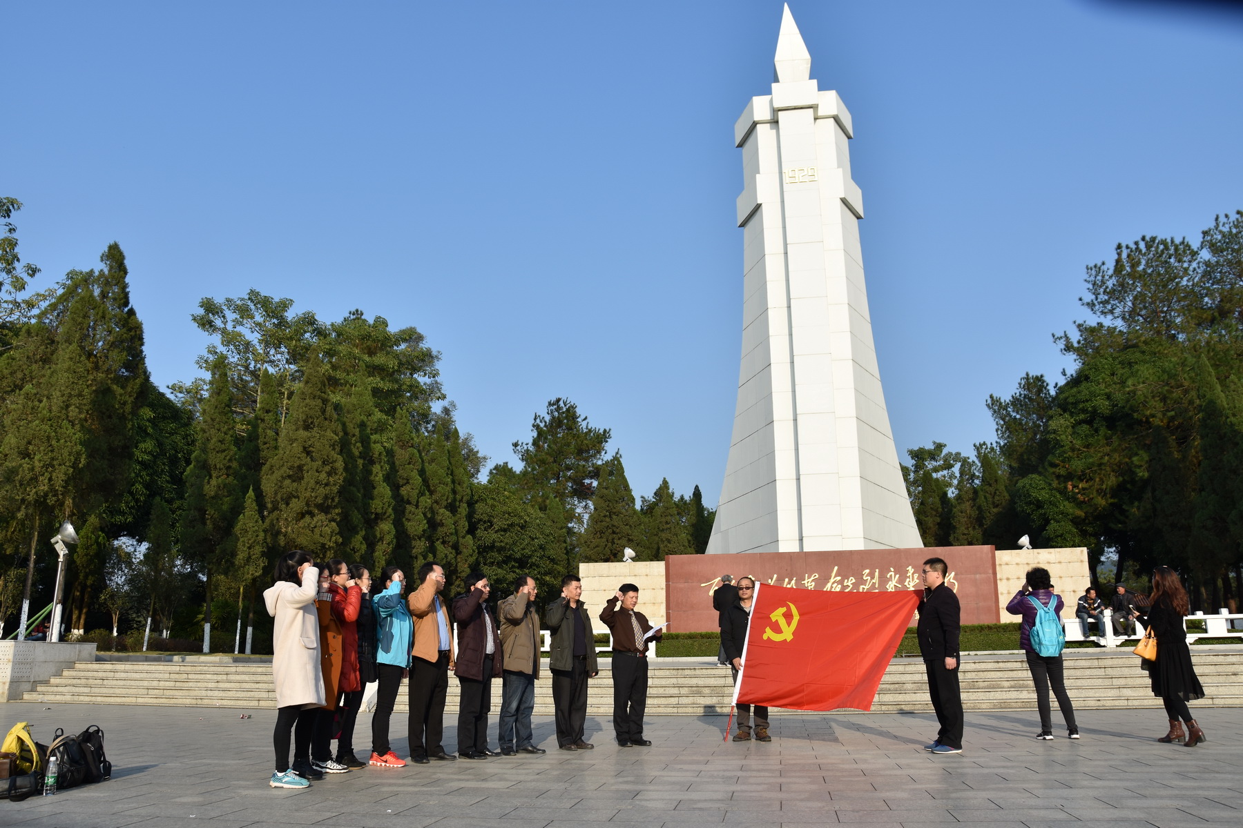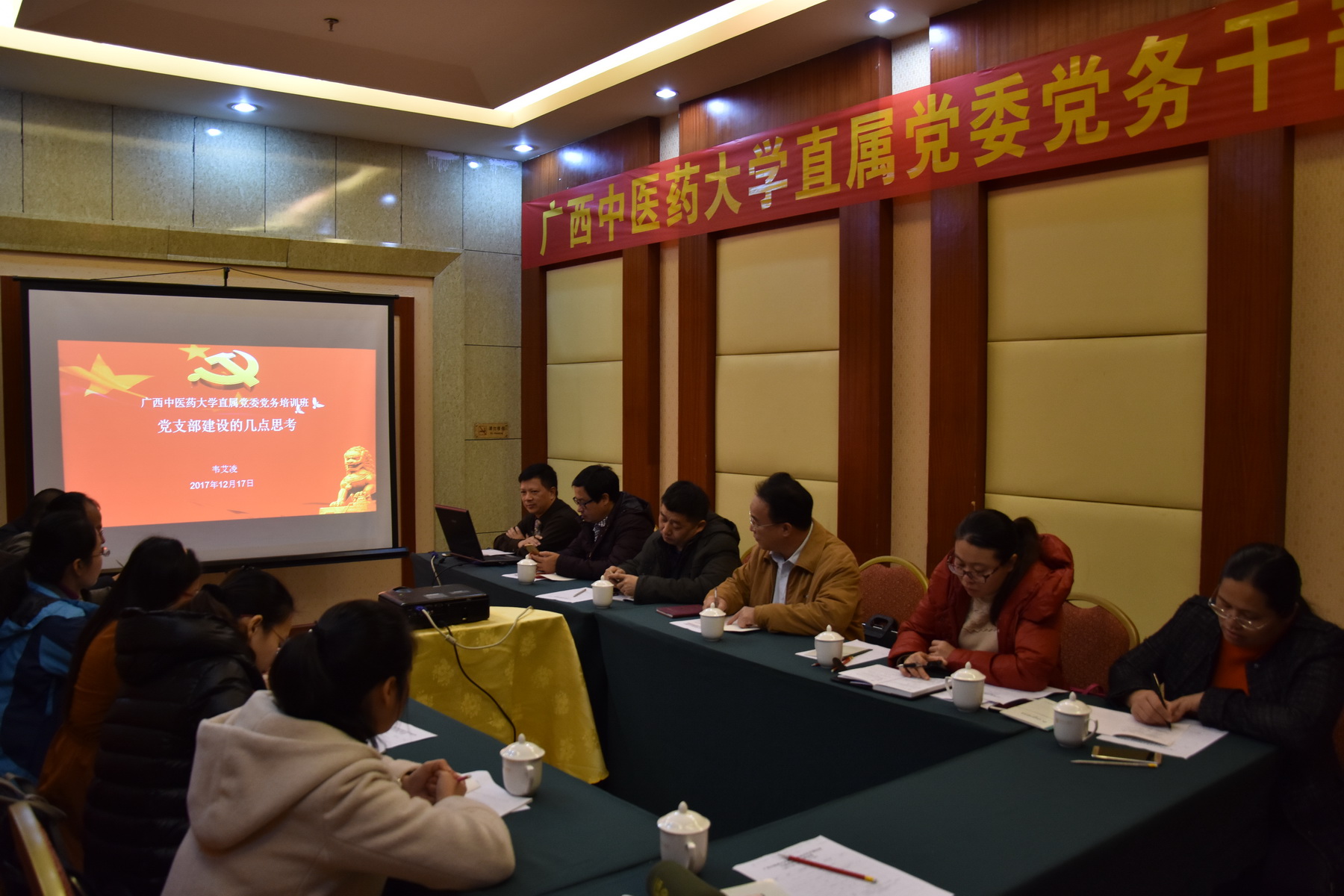为深入学习十九大会议精神,学习贯彻习近平总书记系列重要讲话精神和治国理政新理念新思想新战略,进一步加强直属党委基层党务干部队伍和基层党组织建设,落实全面从严治党要求。直属党委于12月16日至12月17日组织各支部支委前往百色开展党务干部培训。直属党委书记韦艾凌、副书记覃振林以及图书馆、编辑部、成教院、骨伤学院、马克思主义学院等党支部的13名支部书记、委员参加了培训。本次培训由韦艾凌书记以《党支部建设的几点思考》、曾婷老师《八七会议》两个专题开展理论学习,给全体学员从中国共产党的革命史再到党的基层组织建设等方面作了全面深入地理论培训。通过组织全体学员前往百色起义纪念馆,瞻仰百色革命烈士纪念碑、重温入党誓词等系列的现场教学体验,让学员们深入领会革命来之不易,更坚定了共产党员的理想信念,激发了自己的责任感和使命感。