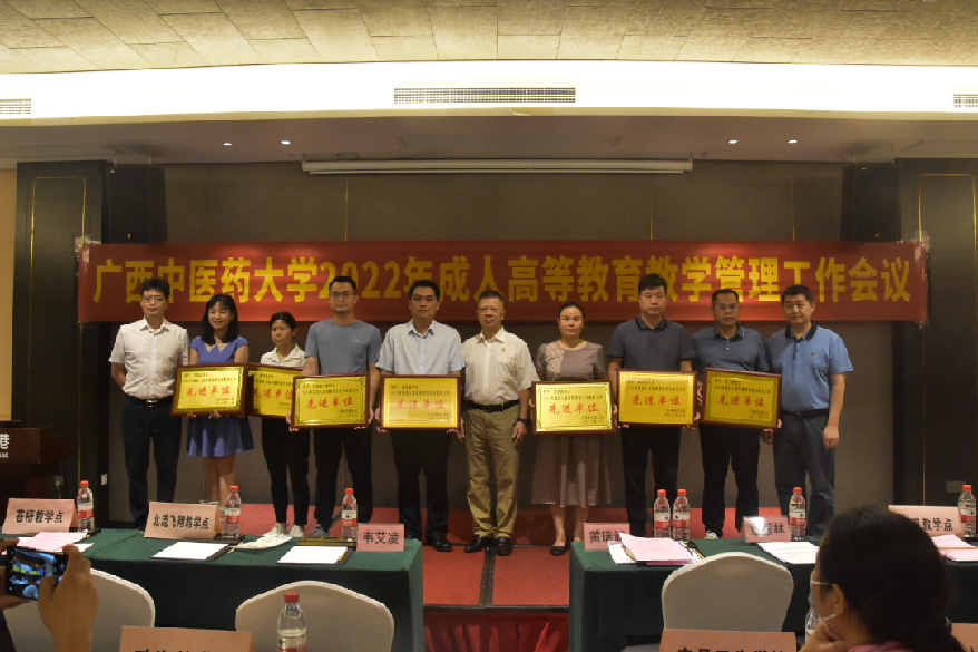 直属党总支副书记、成教院副院长覃振林宣读了《beat365正版唯一入口必一关于表彰2021年度成人高等教育招生与教学工作先进单位的决定》,成教院领导班子为获奖单位颁发牌匾。