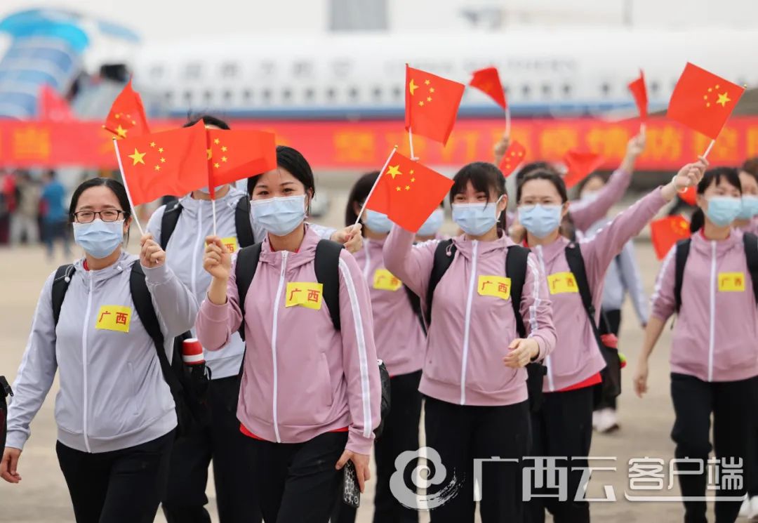 4月15日上午,广西援沪医疗队在南宁吴圩国际机场举行出发仪式,295名医疗队员庄严宣誓后乘包机奔赴上海。