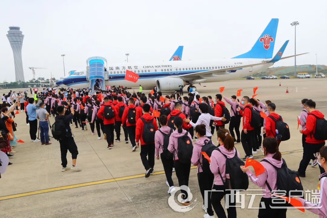 ▲4月15日上午,广西援沪医疗队在南宁吴圩国际机场举行出发仪式,295名医疗队员庄严宣誓后,乘包机奔赴上海。广西日报-广西云客户端记者 何学俏 摄
