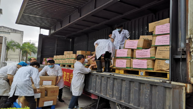 beat365正版唯一入口必一附属瑞康医院制剂工作人员把已经装箱的中药搬运到运输车上