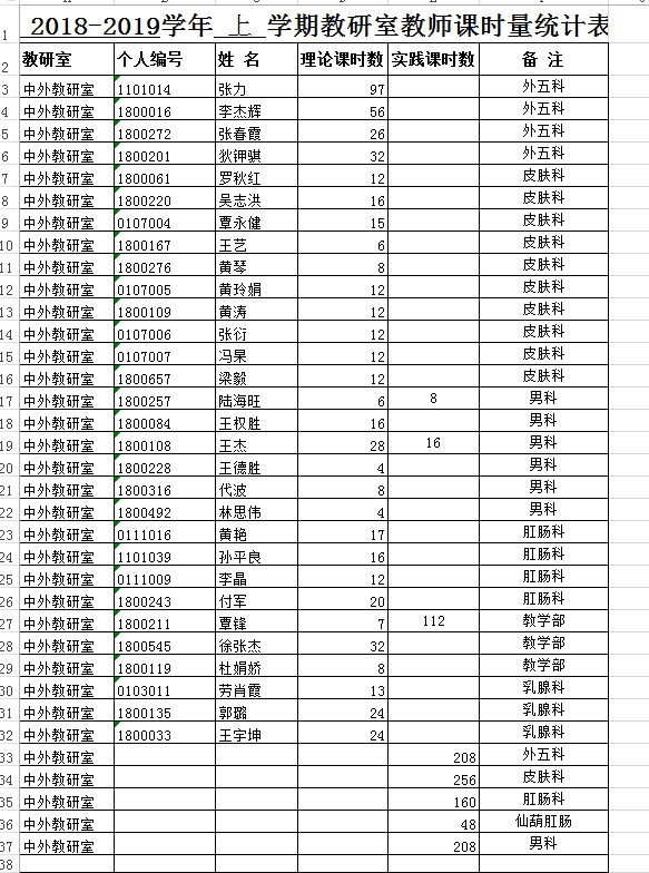 2018-2019学年上学期教研室教师课时量
