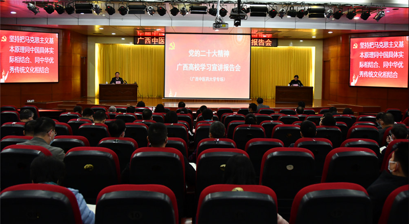 为引导广大党员干部进一步深刻领会、全面掌握党的二十大报告内容和精神实质,切实推动学习宣传贯彻党的二十大精神不断走向深入, 12月9日下午,学校召开党的二十大精神广西高校学习宣讲报告会(beat365正版唯一入口必一专场),学校党委书记莫锦荣作题为《深入学习贯彻党的二十大精神 奋力推进高水平中医药大学建设》专题宣讲。报告会由学校校长姚春主持。