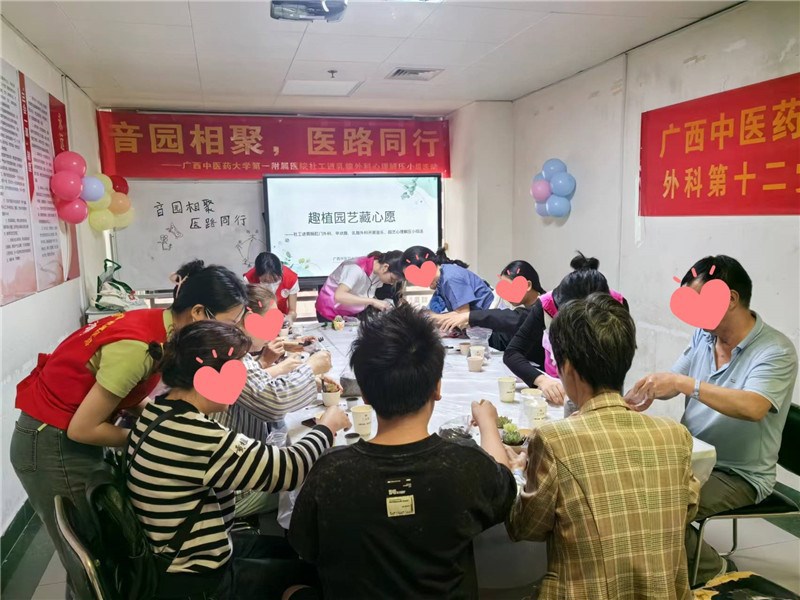 为帮助患者舒肝养气,调整情志,我院团委、社工部联合胃肠肛门外科、甲状腺、乳腺外科于11月6日开展“音园相聚,医路同行”音乐、园艺治疗小组第二节“趣植园艺藏心意”活动。