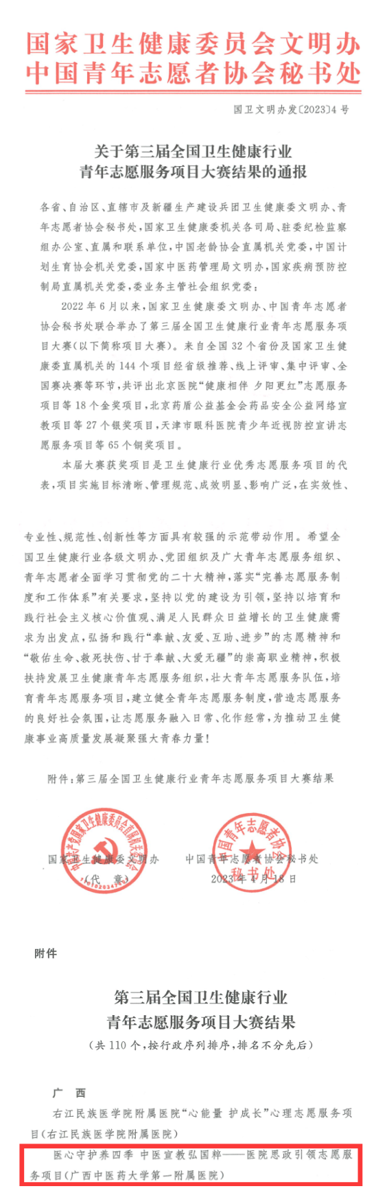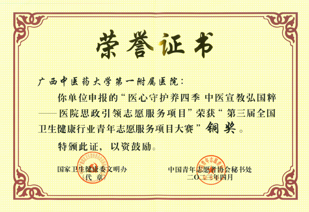 近日,接国家卫生健康委员会文明办、中国青年志愿者协会秘书处联合下发的《关于第三届全国卫生健康行业青年志愿服务项目大赛结果的通报》,我院《医心守护养四季中医宣教弘国粹——医院思政引领志愿服务项目》荣获第三届全国卫生健康行业青年志愿服务项目大赛铜奖,是全广西三个获奖项目集体之一。