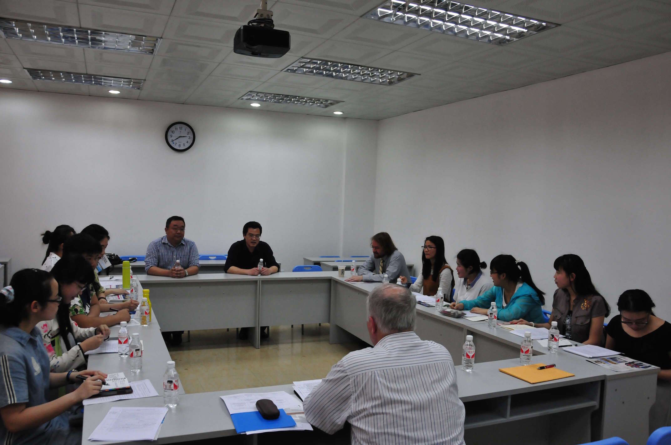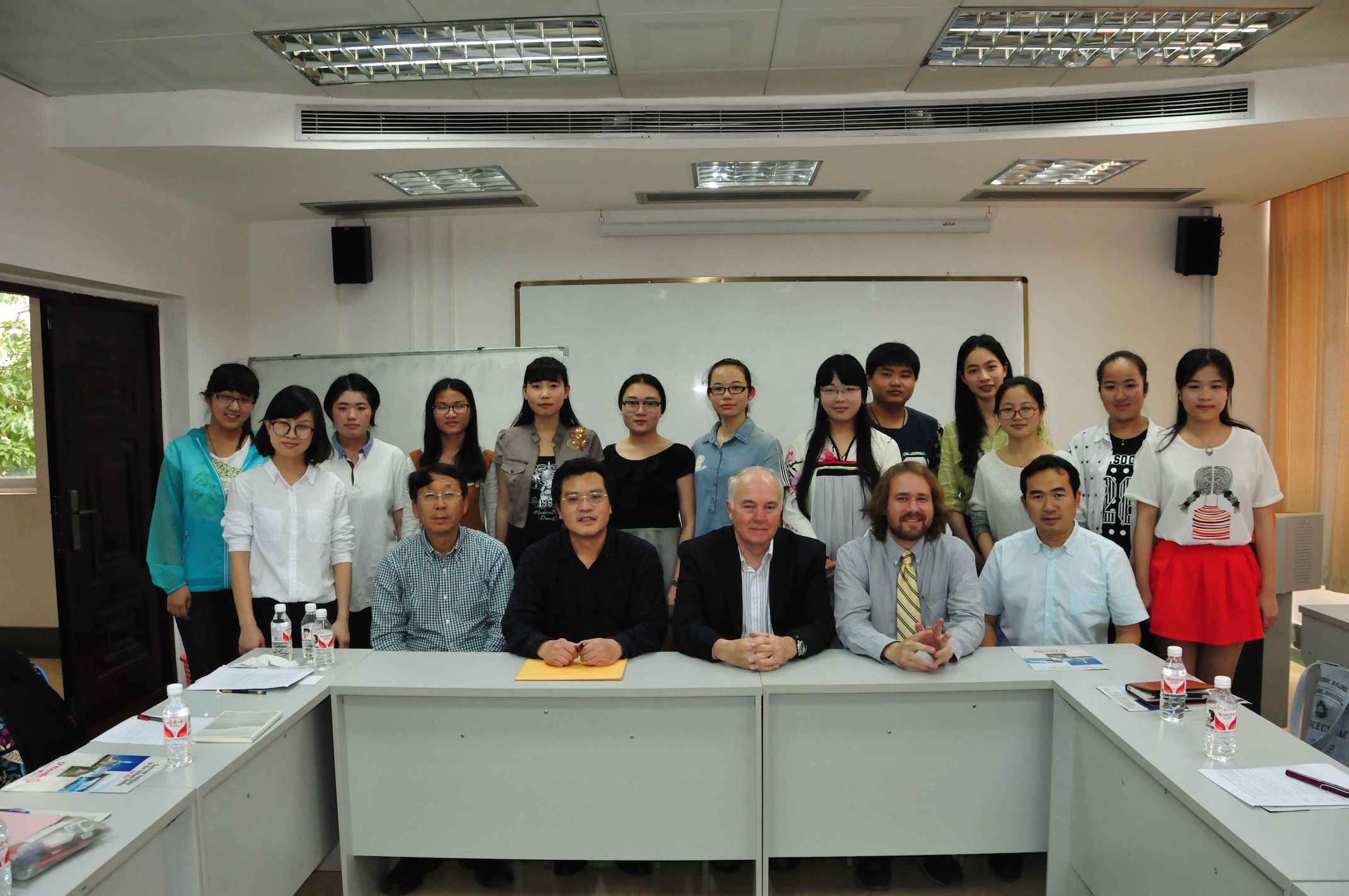 2016年4月6日上午,美国督优维尔学院国际招生与市场部主任罗恩·丹尼卡先生,布法罗中美文化交流中心执行董事陈树清博士一行2人访问beat365正版唯一入口必一。beat365官网国际教育学院蒋基昌院长在国际教育学院会议室接待了该代表团成员并举行了座谈会,出席座谈会的有办公室主任郭宇航、项目部主任陈斌以及教学部文娟。当天下午,美国督优维尔学院罗恩·丹尼卡先生在会展中心展六教室为两校合作举办的护理学本科项目的2015级学生代表进行了现场答疑会。
