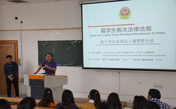 首先,南宁市公安局出入境管理分局三大队大队长梁毅和梁爱晶警官就外国人签证类型,非法滞留等留学生关心的出入境相关法律法规做了详细的讲解。特别强调在校留学生不得非法居住或就业、注意自己签证的有效时限,避免因疏忽发生非法居留的违法行为。接着南宁市公安局西乡塘分局人口大队副队长黄绍相警官在讲座中强调,在华留学生必须遵守中国法律法规,不得有危害中国国家安全、损害社会公共利益和破坏社会公共秩序的行为,并就贩毒吸毒、打架斗殴、偷盗财物,违规持有非机动车牌照等违法犯罪行为的判定和处罚措施进行了详细生动的讲解。接着学校保卫处陆会林副处长发言,希望留学生务必遵守学校各项规章制度,特别要求提高防火安全意识,注意电单车的校内驾驶和停放以及注意排除宿舍的违规电器安全隐患等。