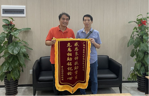 2021年6月29日上午,时隔3个月后,国际教育学院2019级传统中医班的刘同学(来自香港)又回到了学院,专程携夫人来向老师和同学们赠送锦旗表示感谢。韦文朗副院长、国教院的老师和部分同学在院长办公室会客室与刘同学夫妇友好地交谈,看到刘同学良好的康复大家由衷欣慰和高兴,韦副院长高度赞赏了所有参与到救治过程的老师和同学们。