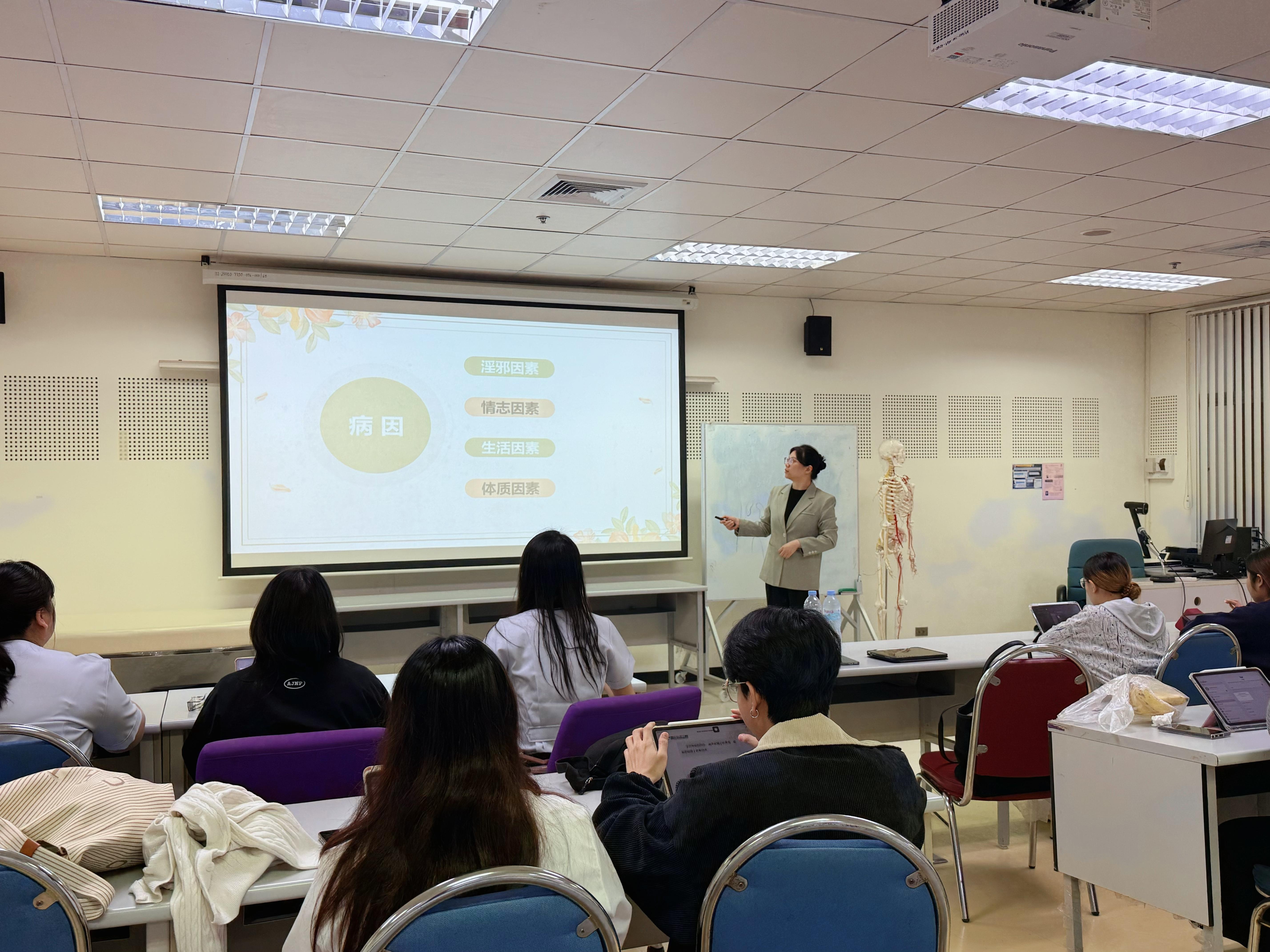 授课期间,董广敬老师将丰富的临床经验融入教学,系统讲授中医耳鼻喉专业知识,课堂生动有趣;郭华老师通过典型案例分析和现场实操演示,帮助学生直观理解中医妇科诊疗技法。两位教师的教学深受学生欢迎,课堂反响热烈。