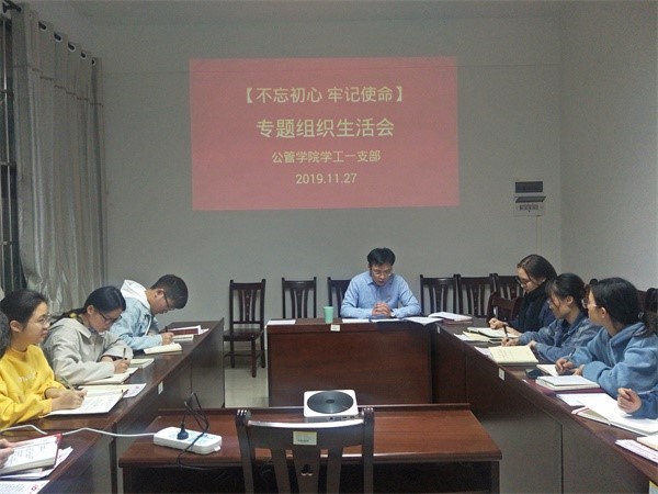 11月27日下21:30,院学工一支部在大学生活动中心A111开展“不忘初心、牢记使命”组织生活会,支部书记宋南以及一支部全体在校生党员参加了会议。会议由宋南主持。