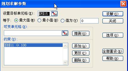 用鼠标左键单击〔工具〕菜单中的〔规划求解〕选项,弹出〔规划求解参数〕对话框,对话框参数解释如下: