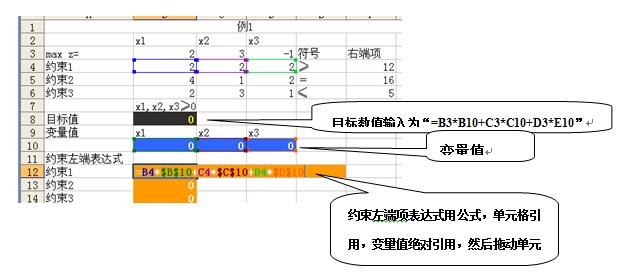 设置目标单元格:一些单元格、具体数值、运算符号的组合。注意:目标单元格一定要是公式,即一定是以“=”开始。类似于线性规划中的目标函数。