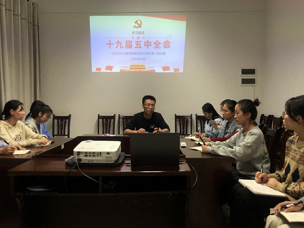为深入学习党的十九届五中全会精神,11月15日晚上,公管学院党总支学生第一党支部在大学生活动中心A111开展主题为“学习解读十九届五中全会精神”的全体党员主题教育。全体在校生党员及发展对象参加了此次学习。