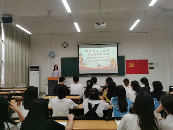 为庆祝建党一百周年,推动我院学生崇党爱国思想教育,公共卫生与管理学院学生第二党支部于7月1日17:30在仙葫校区教学楼1-113开展了7月主题党日活动,共同鉴赏支部党员创作的以建党一百周年为主题的书画作品,全体支部党员和入党积极分子到场参与。