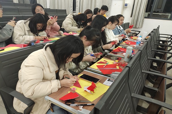 活动伊始,学生第一党支部书记宋南和学生第二党支部书记鲁蕴律为大家示范党徽和窗花的剪纸技巧,随后由同学们动手绘画设计和剪纸。现场气氛热烈,欢声笑语,党员们用巧手和热情完成了一张张剪纸作品。最后,党员们将制作好的党徽剪纸张贴起来进行展示并合影留念。