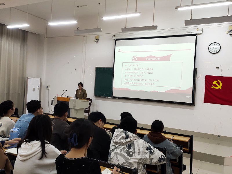 会议伊始,鲁蕴律首先向支部全体党员介绍两会(中华人民共和国人民代表大会和中国人民政治协商会议)的时间设立依据,即两会是根据1989年七届人大二次会议通过人大议事规则,确定人代会每年一季度举行的这一现实基础出发,合理兼顾全国人大“批准工作报告”和“预算报告”的重要职责而把两会时间定在3月召开,号召支部成员积极关注两会热点,关注国家大事,紧跟时代步伐,立足新起点,阔步新征程。随后,鲁蕴律分别从“届”和“次”、“代表”和“委员”、“提案”和“议案”、“权利”和“权力”和“共商国是”而不是“共商国事”等两会常用的词汇中,带领全体成员正确区分两会。最后,鲁蕴律从“人民”、“过程”、“全”三个方面出发,介绍了“何为全过程人民民主”,对“全过程人民民主”的民主形态进行精确阐释与科学表达,引领党员积极分子们坚持以人民为中心,始终把最广大人民根本利益放在心上。党课结束,党支部成员还主动上台分享自己学习两会知识的心得。