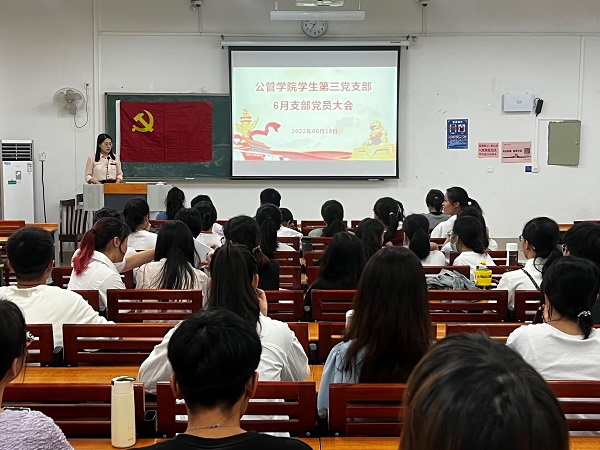 公管学院党总支学生第三党支部 6月18日上午9:30在仙葫校区教学楼1-206教室召开支部大会讨论接收明锐等23名同志为预备党员问题。会议由支部书记唐梧茜同志主持,支部8名正式党员、23名发展对象及41名入党积极分子参与此次会议。
