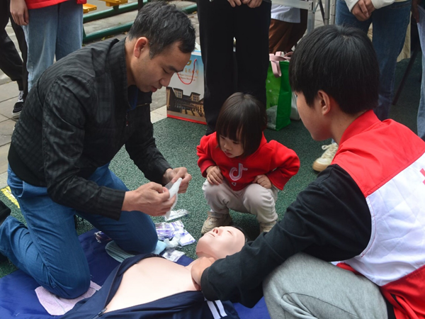 社区居民在练习心肺复苏急救操作