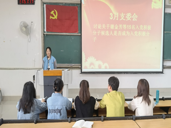 最后召开了3月支委会,讨论谢金芳等15名入党积极分子候选人是否成为入党积极分子。候选人逐个介绍自己的在校表现、入党动机和对党的认识,经支部委员无记名投票,同意谢金芳等13位同志为入党积极分子。