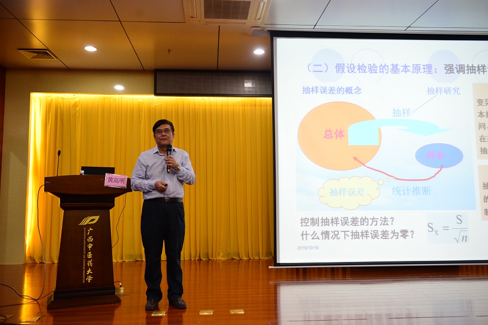 黄教授首先用最通俗易懂的生活例子解释统计学的思维理论,深入浅出的进行了统计学应用、统计学科学研究、数据统计挖掘、统计分析结果判断的经典介绍。强调基础统计学教学一定要围绕“一条主线、两种方法”进行理论教学,“一条主线”即抽样误差,它是统计学的灵魂,“两种方法”是统计描述和统计推断,强调了统计思维的过程是检验我们科学研究是否符合科学的基本原则,讲述了系统误差、随机误差、抽样误差的实际意义和科学价值。
