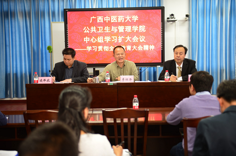 11月27日下午,公共卫生与管理学院召开中心组学习扩大会议,学习贯彻全国教育大会精神。会议由院长董柏青主持,院党委书记李怀泽向学院全体教师传达了全国教育大会的精神,并结合自己的体会从国家、学校和教师层面谈了培养什么人、怎样培养人、为谁培养人的问题。