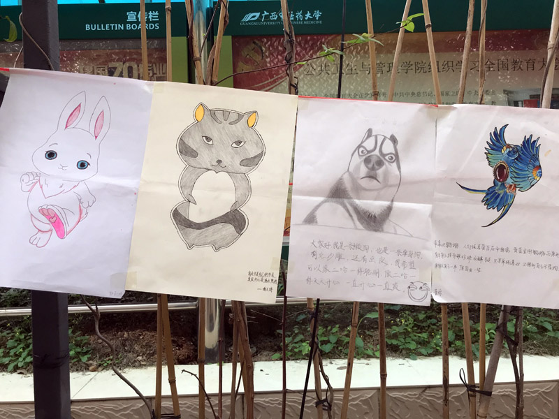 近日,公共卫生与管理学院心理系在本学期《大学生心理健康教育》课程的作业——《动物自画像》中,选取了2018级部分班级的心理自画像作品在昆第长廊张贴展示。
