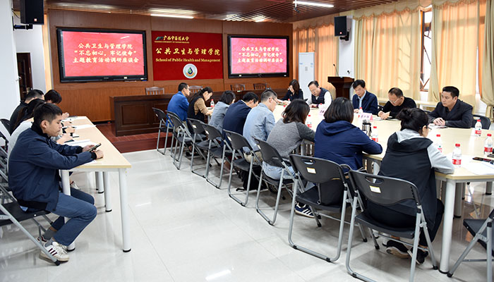 为了深入学习贯彻“不忘初心、牢记使命”主题教育精神,找问题、抓落实、促整改,10月31日下午,吴琪俊副校长到公共卫生与管理学院进行调研。公共卫生与管理学院党总支书记李怀泽、院长董柏青、副书记凌泽农、副院长王碧艳,以及公管学院各系和教研室的负责人出席了调研座谈会。