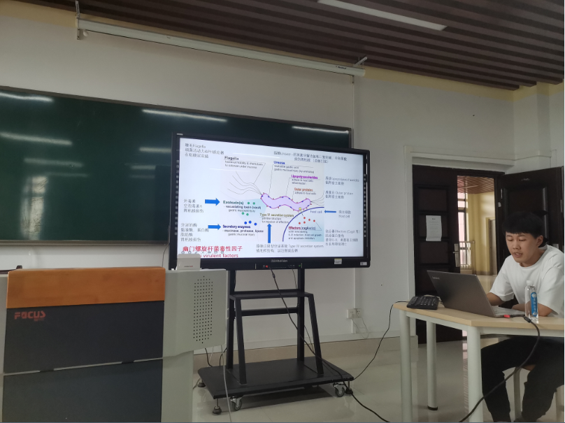 本次报告会第一个做汇报的是2021级中药学研究生张伟利,做了题为《天然药物对幽门螺旋杆菌抑菌效果的研究进展》的汇报,第二位是2021级护理学研究生蒋青健,做题为《主动脉内球囊反搏术》的汇报。20级研究生苏永健对幽门螺旋杆菌(HP)毒力因素的相关问题与HP的检查方法做出了提问。学术报告会旨在加强我院研究生之间的互相交流,促进不同研究课题之间的思想碰撞。