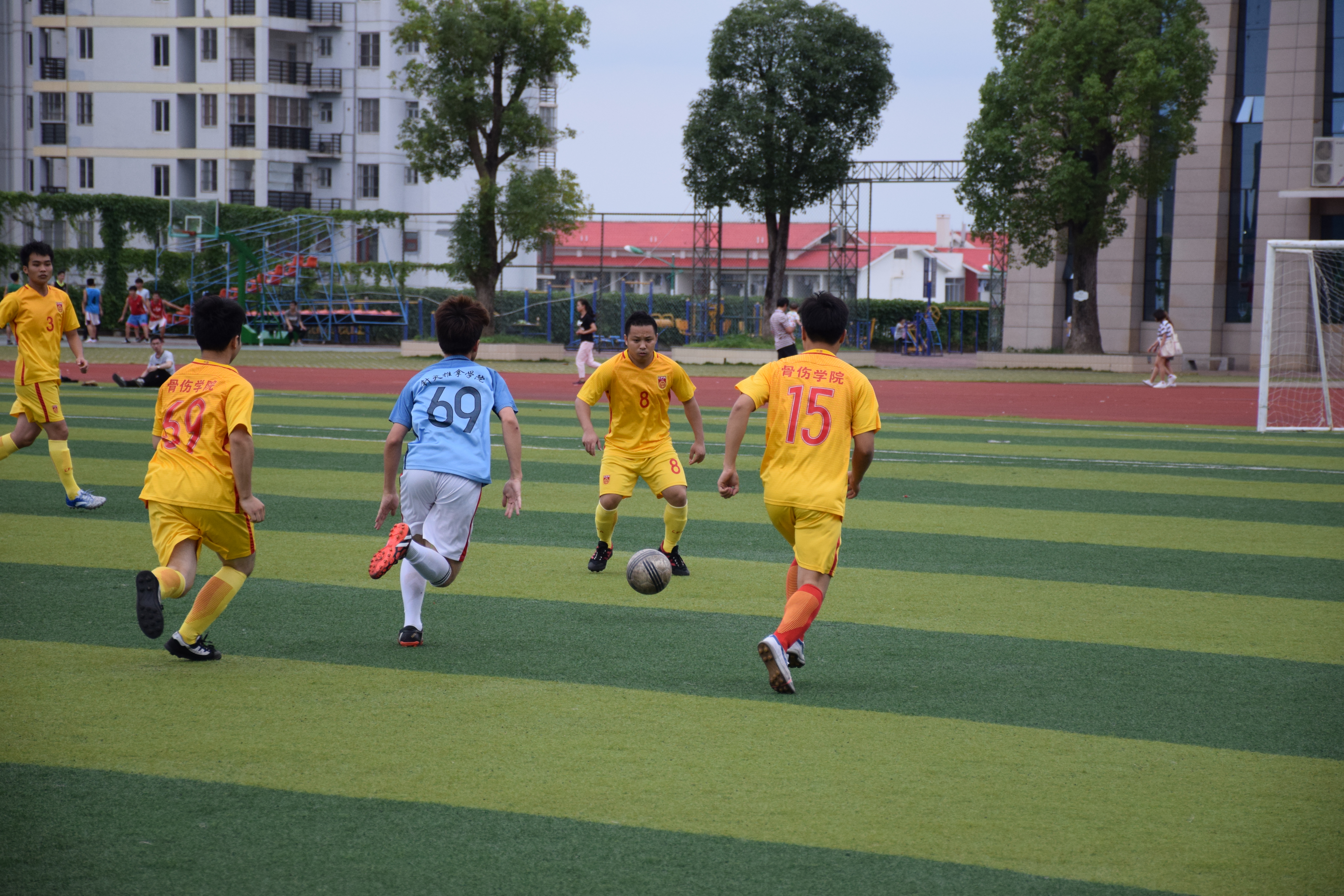 随着一声哨响,比赛正式开始了。上半场刚开始针推学院就趁骨伤学院立足未稳先进一球。但骨伤学院毫不示弱,凭借积极地拼抢,顺利进球得分,将比分拉平。下半场,针推学院重新调整了战略队形,调整心态进行反攻,骨伤学院的每一位队员的激情丝毫不弱于针推学院,不断进攻。场上形势越来越胶着,时时发起高潮,场边的观众也渐渐的多了起来,大家连连欢呼叫好,紧张的气氛一直环绕在球场上方。比赛进入尾声,双方以1:1的比分僵持不下,最后,经过激烈的点球大战比分定格在5:3,骨伤学院再度获胜!
