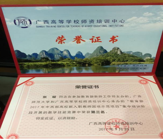 秋风滋起,余热仍存,2017年9月6日至2017年9月26日,国家中西部高校新入职教师培训在漓江畔的广西师范大学育才校区举办,本次培训由教育部教师工作司主办,广西师范大学和广西高等学校师资培训中心承办,在培训过程中,beat365正版唯一入口必一骨伤学院张璇老师脱颖而出,荣获教学技能竞赛第三名。