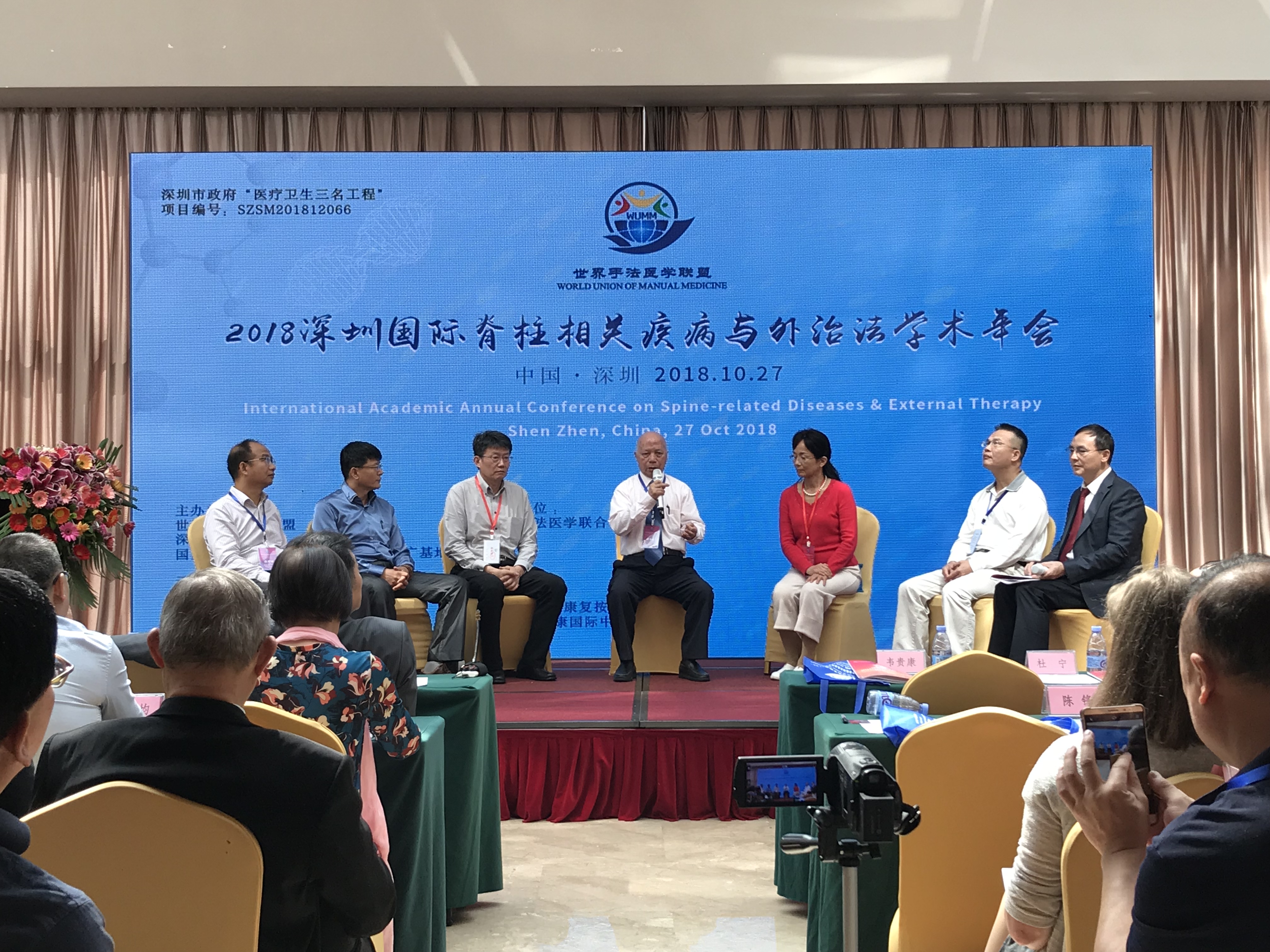 2018年10月27日,由中国执行总部驻扎在beat365正版唯一入口必一的世界手法医学联盟与国家中医药管理局中医流派传承推广基地共同主办,深圳市中医院、广东发展中医药事业基金会等单位承办的“世界手法医学联盟2018深圳脊柱相关疾病与外治法学术年会”在深圳召开,会议汇集了中国、中国香港、中国台湾,意大利、美国、加拿大、日本、新加坡、马来西亚、菲律宾等13个国家和地区的医学同道,通过专题讲演、专题讨论、特色疗法介绍等形式,深入研讨了脊柱相关疾病与中医外治法在脊柱病的应用。