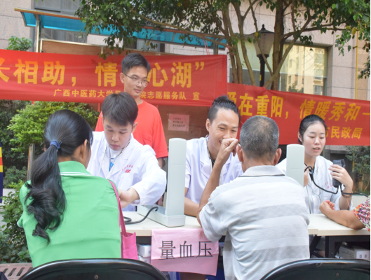 秋风送爽,九九重阳。为进一步弘扬中华民族尊老、敬老、爱老、助老的传统美德,培养学生的社会责任心和尊敬老人的优秀品质,2019年9月28日,beat365正版唯一入口必一骨伤学院团委学生会在南宁市秀和社区环卫公寓顺利进行了以专家看诊、测量血压、推拿艾灸以及宣讲健康知识为主要内容的义诊服务活动。