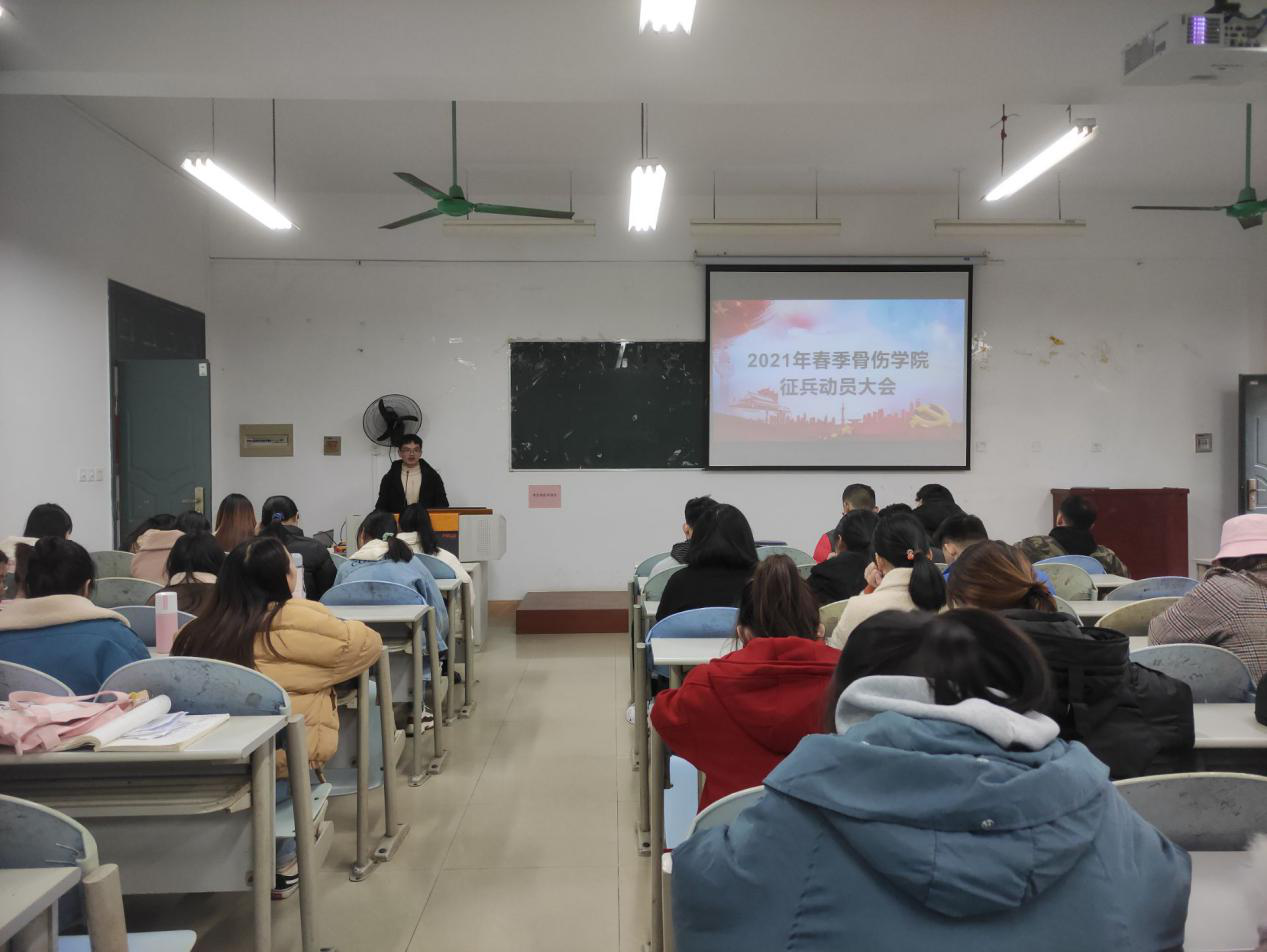 根据《beat365正版唯一入口必一2021年春季征兵工作方案》文件的精神,骨伤学院2021年1月13日于明秀东新东一教室召开2021年春季征兵动员大会。会议由骨伤学院温健老师主持,在会上,温老师向同学们转达了上级的征兵工作精神,细致为同学解读相关征兵工作文件、报名步骤、优待办法等,鼓励有志参军入伍,报效祖国的同学积极报名。通过本次大会,同学们了解知悉了报名参军的各项相关政策,有利于推动今后的征兵工作。