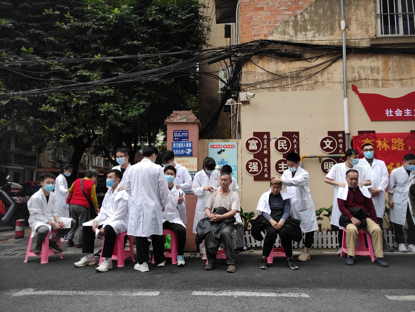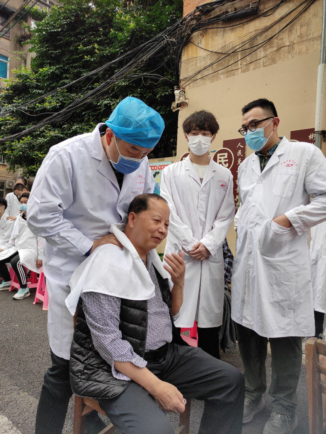 同学们到达义诊地点后有条不紊地布置场地,挂上条幅,摆好桌椅,井然有序地做好了准备工作。义诊开始,同学们积极进行义诊活动,帮助居民。血压组同学仔细了解居情况,叮嘱运动过的居民休息之后再量血压。手法组游刃有余地为居民做手法,放松肌肉、关节。还有艾灸组的同学在背风处为居民进行艾灸,效果甚佳。各组同学都对居民进行了人文关怀。