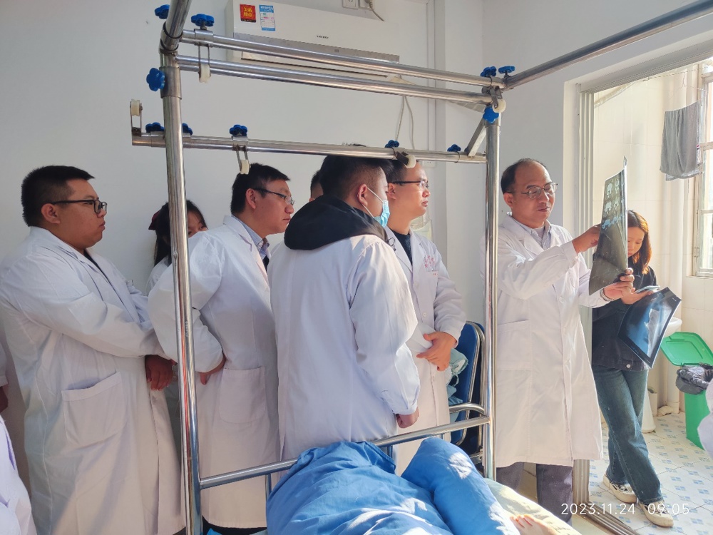 11月24日上午,周红海教授、曾平教授对在院的骨伤科病人进行深入详细的教学查房。在查房过程中,周红海教授、曾平教授认真听取主管医生汇报病历,并亲自进行更为细致的体格检查,针对不同病种的诊疗作出进一步的指导说明。在与病人及家属的交谈中,用切合实际的治疗手段解决病人的主要问题,针对科室治疗过程中存在的疑难问题一一进行解答,提出进一步可行的治疗方案。