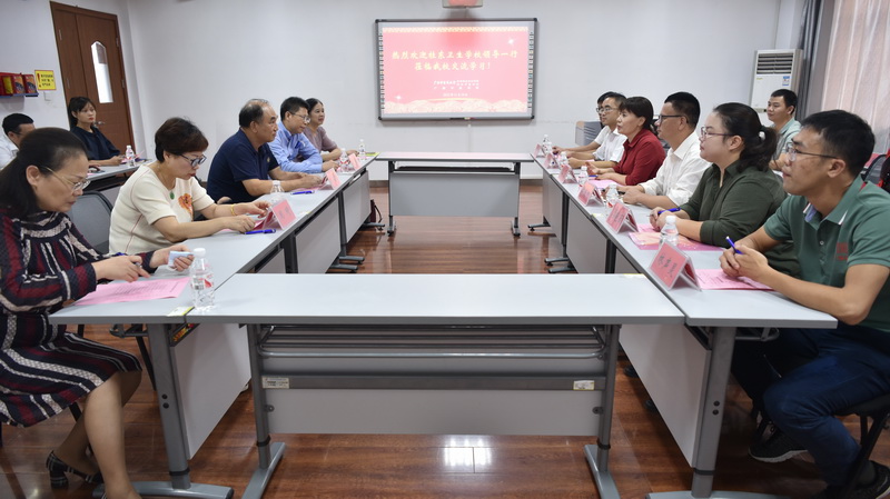 2022年11月10日下午,贺州市职业教育发展中心副主任江乙带领桂东卫生学校副校长覃庆河、张维、梁艳丽一行13人来访 我 校 。 校长刘竑清,副书记、副校长刘武,副校长周琦及相关部门负责人热情接待 了江乙一行,双方 在北湖校区临床实训中心进行座谈交流。