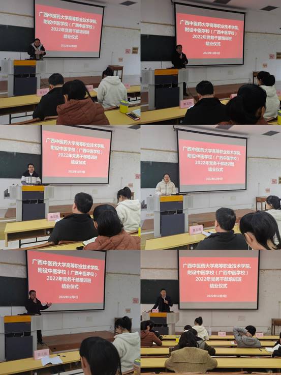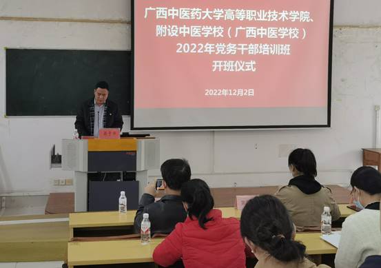 为深入学习贯彻党的二十大精神,加强基层党组织标准化规范化建设,提高新任党务干部业务素质和工作能力,12月2日-12月4日,高职院、附设中医学校党委在明秀校区基础楼西梯三教室举办学习贯彻党的二十大精神暨2022年党务干部专题培训班,高职院、附设中医学校新一届全体党支部委员参加此次培训班。