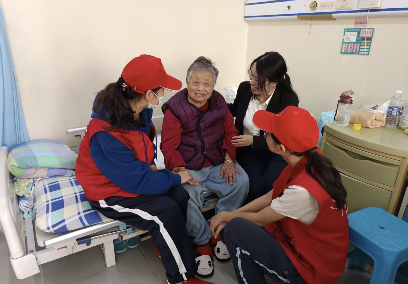 老师党员和志愿者陪老人聊天