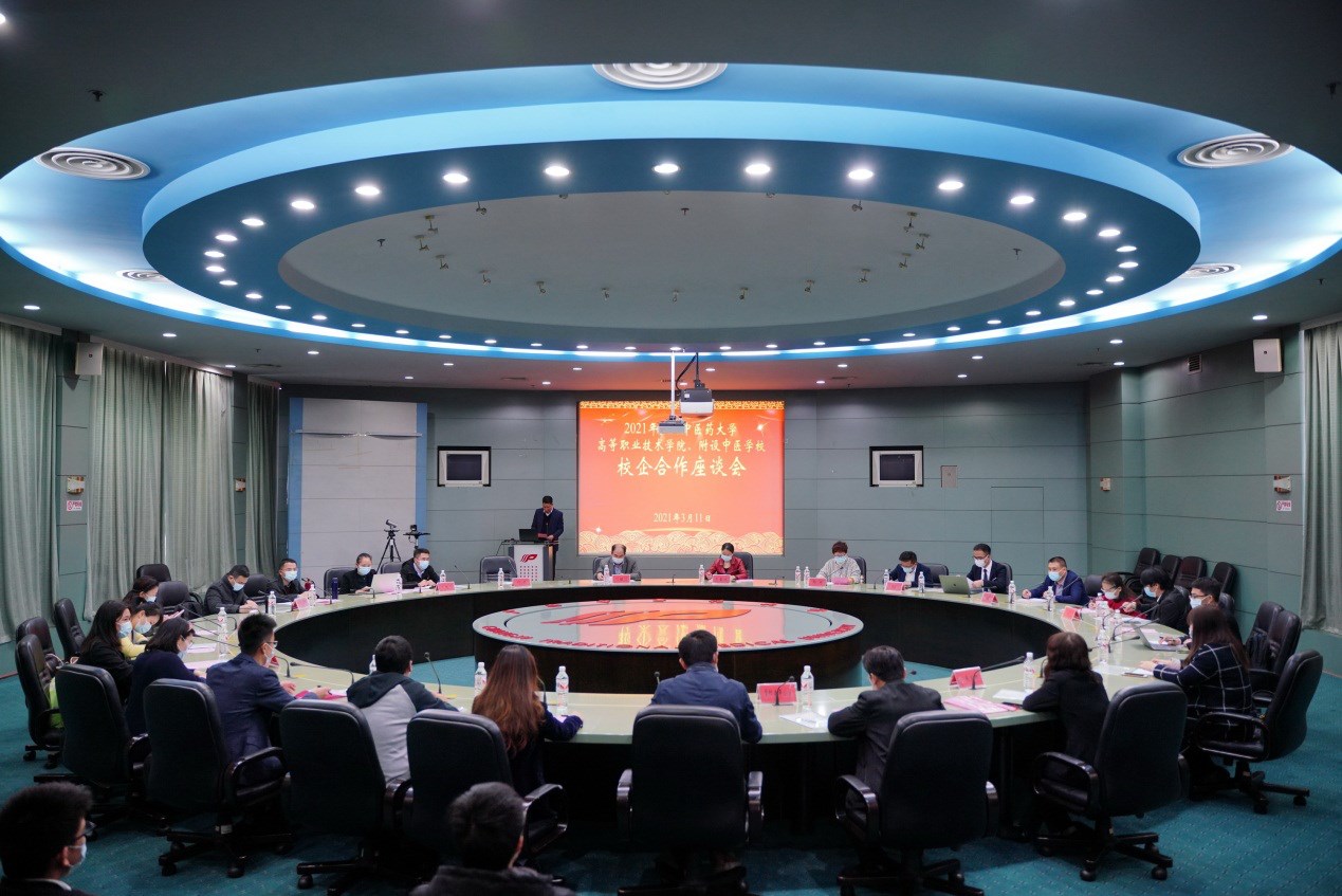 3月11日下午, 高职院、附设中医学校在明秀校区召开2021年校企合作座谈会,教务处处长莫雪妮,高职院院长、附设中医学校校长刘竑清与大参林、健之佳区内外12家校企合作单位代表参加会议。会议由高职院、附设中医学校党委副书记、副院长、副校长刘武支持。