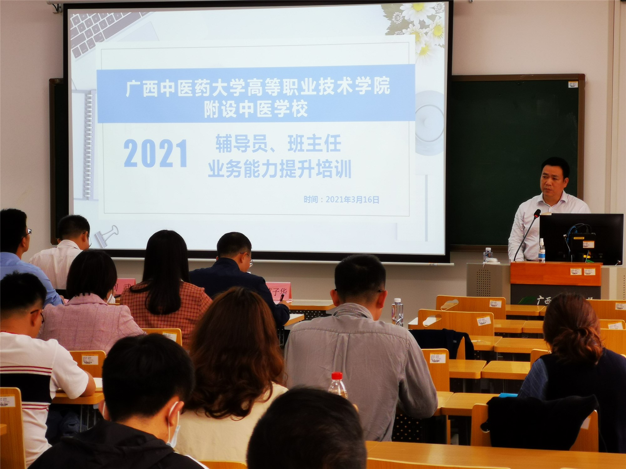 3月16日下午,高职院、附设中医学校在明秀校区时珍楼305教室举行2021年辅导员、班主任业务能力提升培训班。高职院、附设中医学校所有班主任、辅导员参加了本次培训。