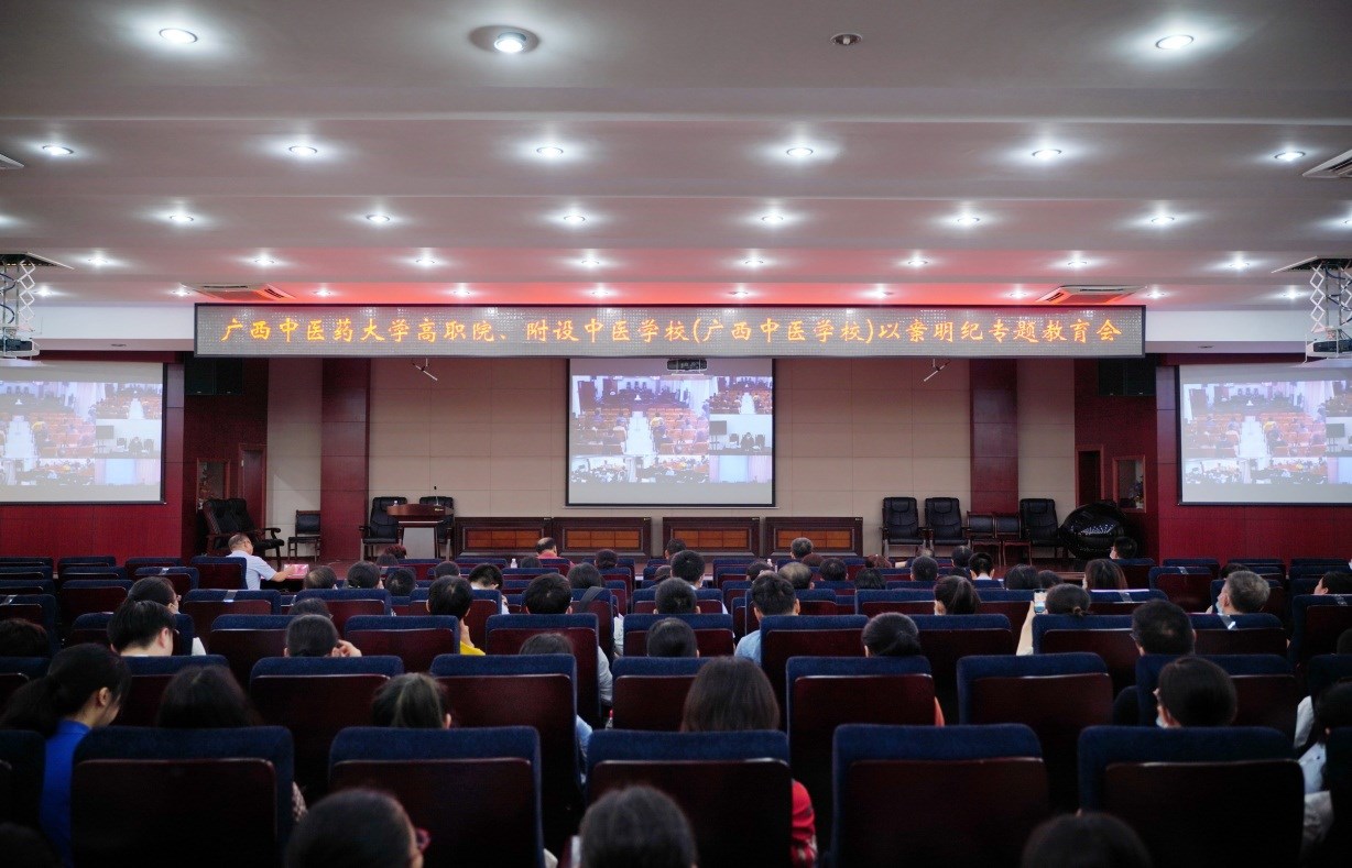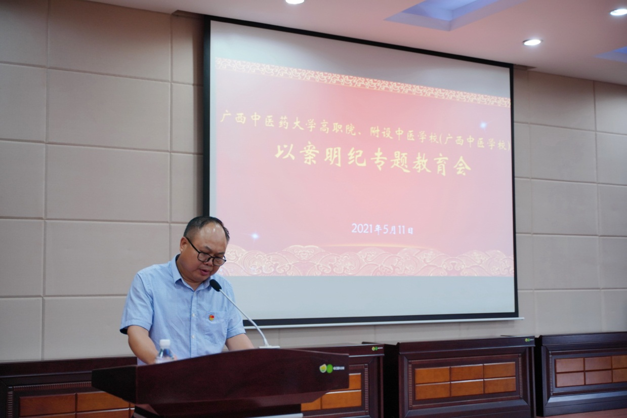 5月11日下午,高职院、附设中医学校在北湖校区多功能报告厅召开以案明纪专题教育会,集体观看了柳州市柳北区人民法院对beat365正版唯一入口必一原基建处处长覃文献涉嫌犯受贿罪进行的公开庭审视频。院(校)全体班子领导、全体中层干部、各部门负责人、全体教职工党员、重点岗位工作人员共130余人参加。纪委书记黄勇主持会议并讲话。