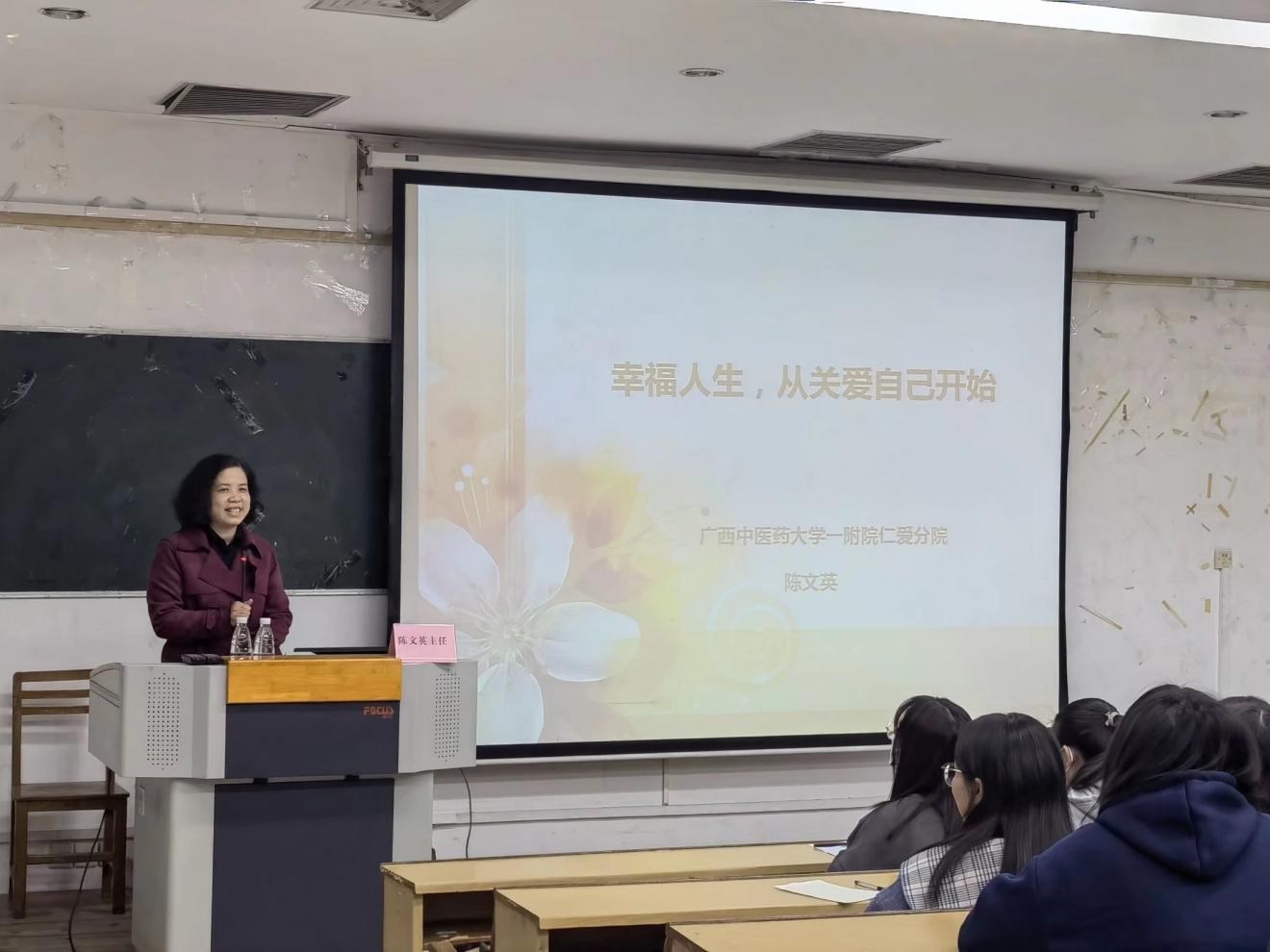 为帮助广大女生了解女性健康和常见女性疾病知识,提高女生生理心理健康水平,12月3 日 19点 ,学院团委学生会在明秀西梯二教室举办“幸福人生,从关爱自己开始”关爱女生健康知识讲座。本次讲座由beat365正版唯一入口必一第一附属医院仁爱分院副主任医师陈文英主讲,明秀、仙葫两个校区近200名女生现场聆听了讲座,学院于春秋老师和丁天全老师参加此次讲座。