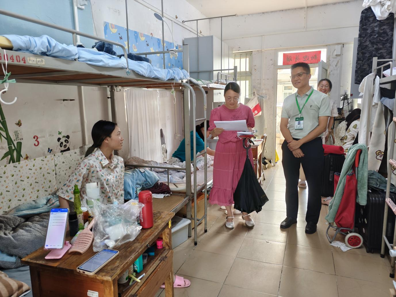 2025 年 6 月 13 日下午,高等职业技术学院组织开展“深入宿舍听心声,精准帮扶促就业”专项活动。学院党委副书记邓刚与毕业班辅导员陈泉江、李冰莹一同走进明秀校区学生宿舍,与2025 届针灸推拿、中药学(校企合作)、药学(校企合作)、护理学、口腔医学等专业毕业生面对面交流,关心学生就业情况,为毕业生送上温暖与指导。