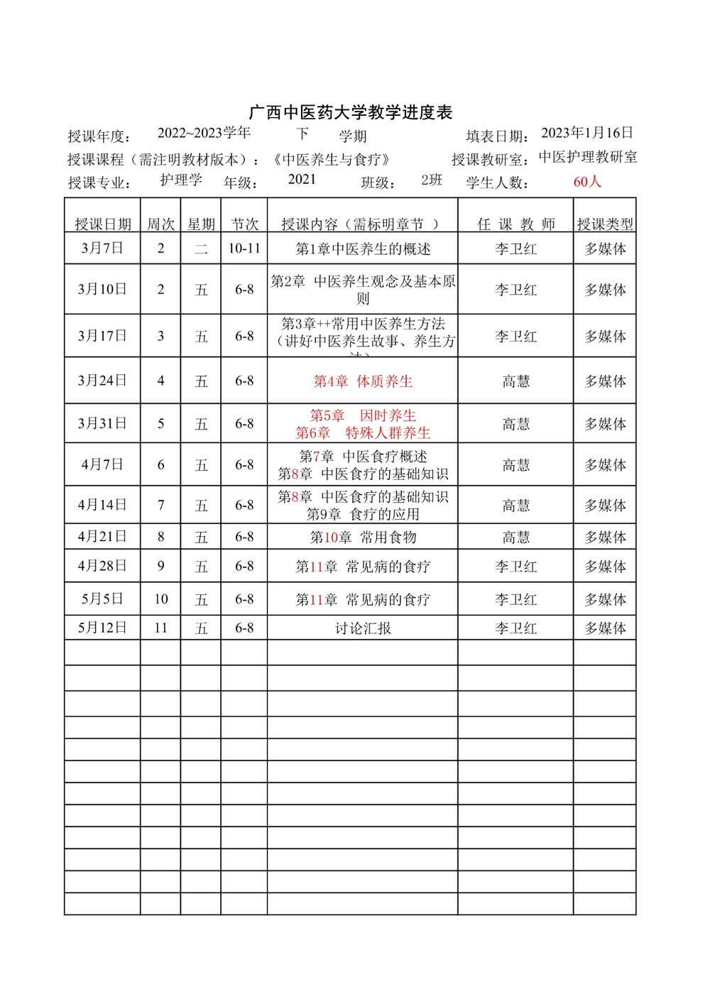2022-2023学年下学期中医护理教研室教学进度表