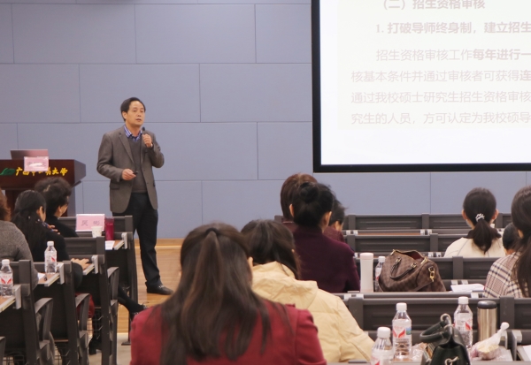 为贯彻落实全国教育大会精神,落实立德树人根本任务, 12月5日护理学院仙葫校区教学楼1-101成功举办线上线下相结合的护理硕士生导师培训班。学校党委副书记庞宇舟、护理学学科带头人杨连招、全体护理硕士研究生导师、护理学院全体教师、直属医院临床带教老师及各培养基地研究生教育管理人员共75人出席了会议。会议由护理学院书记、院长吴彬、副院长马秋平共同主持。