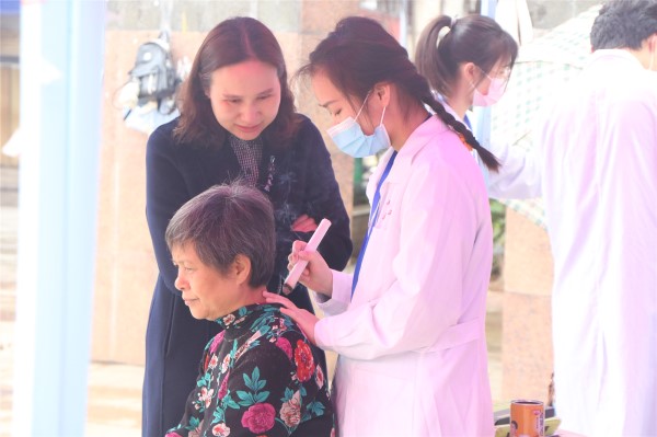 学院党委副书记韩叶芬指导志愿者为居民艾灸