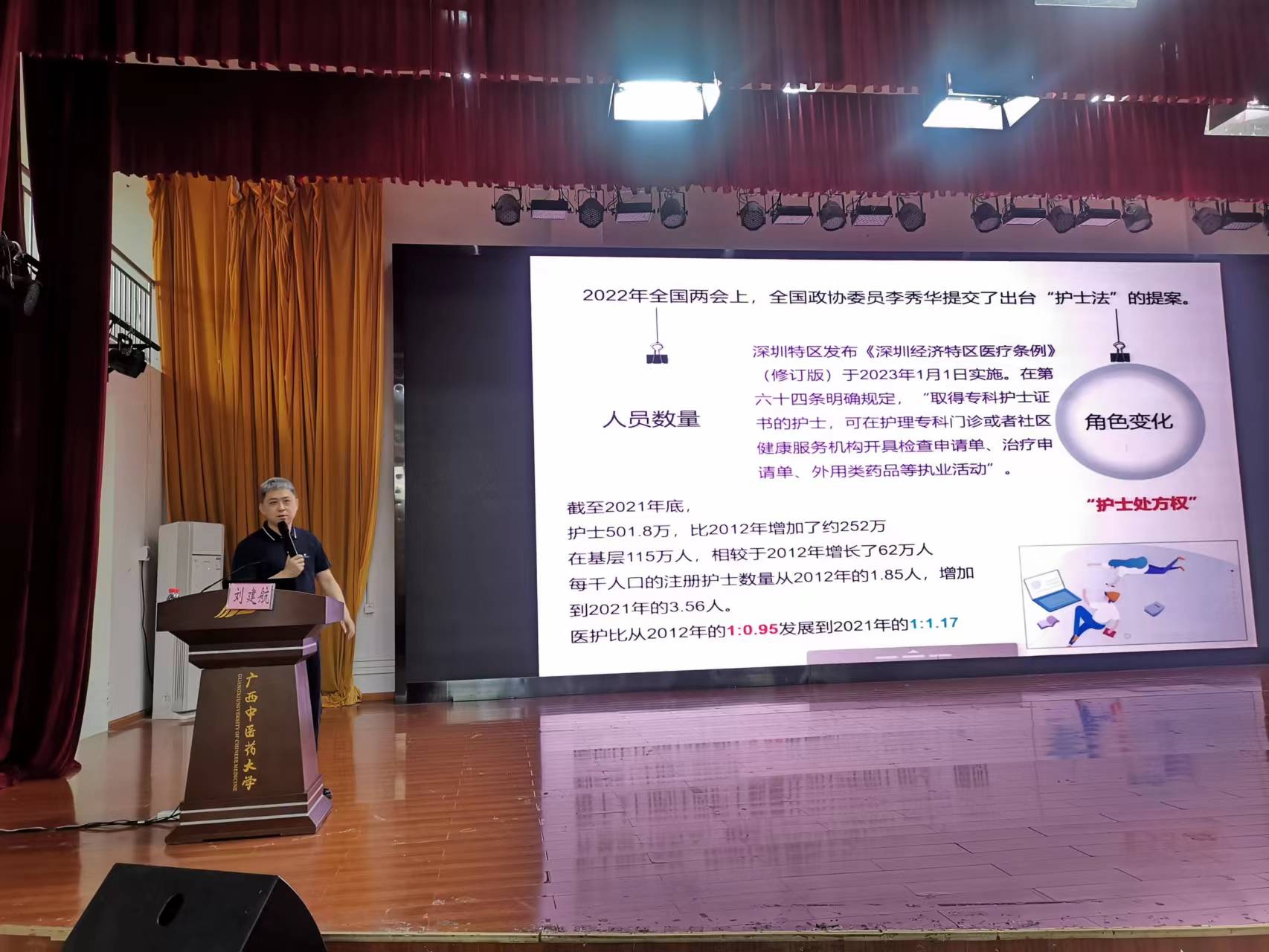 4月16日下午,护理学院“臻善致新”大讲堂第四讲在仙葫校区大学生活动中心小礼堂开讲,北海市中医院党委书记、院长刘建航博士担任本次的主讲嘉宾,为同学们做“教育就业导向与行业用人导向进一步融合的思考之护理人才梯队建设初探”专题讲座,护理学院学生工作办公室主任蓝红霞主持,全校300余名学生参加。